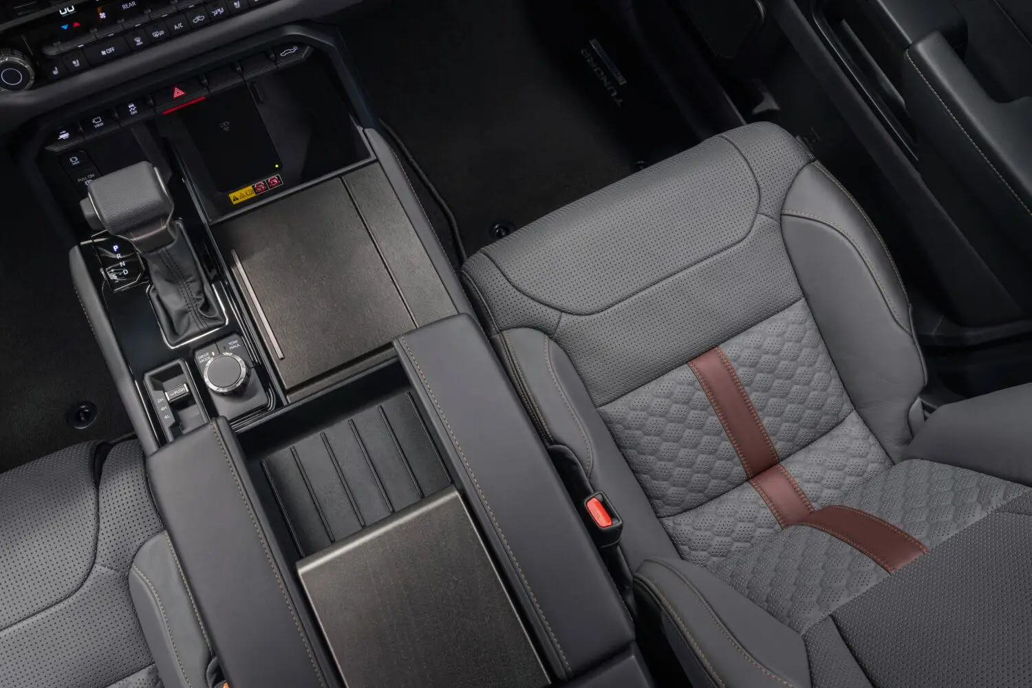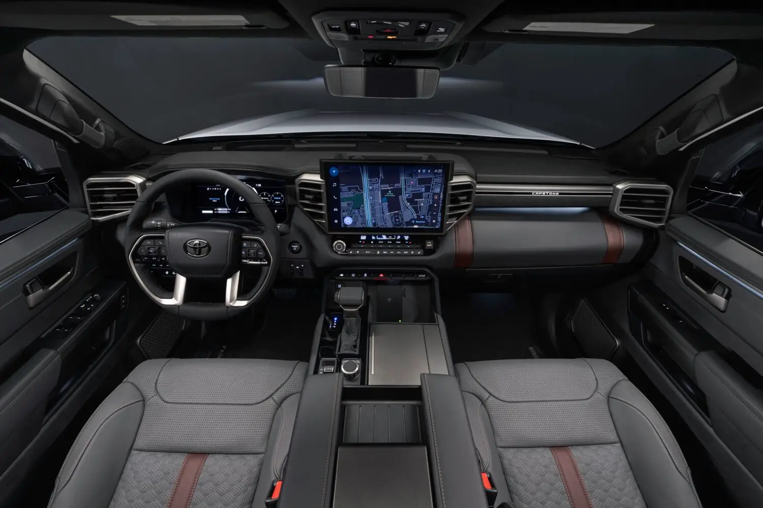 El interior de la Tundra resulta realmente espacioso, con numerosos elementos sofisticados de alta gama que le dan un toque especial, sobre todo en el tope de gama Capstone, que abandona su antiguo tapizado blanco, sustituido ahora por un acabado en cuero texturizado Shale Premium, también conocido como gris oscuro, que sigue teniendo un aspecto lujoso y será mucho más fácil de mantener limpio.